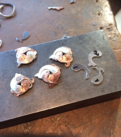 Three slightly different shaped fish were cut out of stg silver, filed to shape then traced on to gold plate.