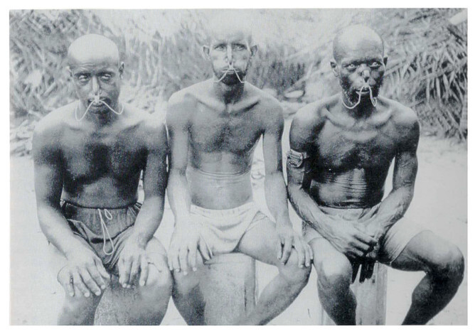 “They have their ear lobes split to allow them to expel air, since their nostrils are plugged with a gadget shaped like an arrowhead and made out of tortoiseshell – that is, the same kind of sea-turtle shell which is used for combs. It may also be made of horn, but not of wood. They put cotton soaked in a little oil in their ears, and when they are at the bottom of the sea they squeeze some out, which gives them a little light. They rub their feet and thighs with a black substance, and this causes the monsters of the deep, by which they fear to be dragged down, to flee far away. When they are at the bottom of the sea, they make sounds like a barking of dogs and this piercing noise serves as a means of communication among them.”