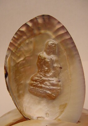 They had worked out that placing a wax or smooth carved object – often a Buddha, inside the shell of a fresh water mussel, would cause it to be coated with nacre. The ornament would be prized or cut away from the shell.