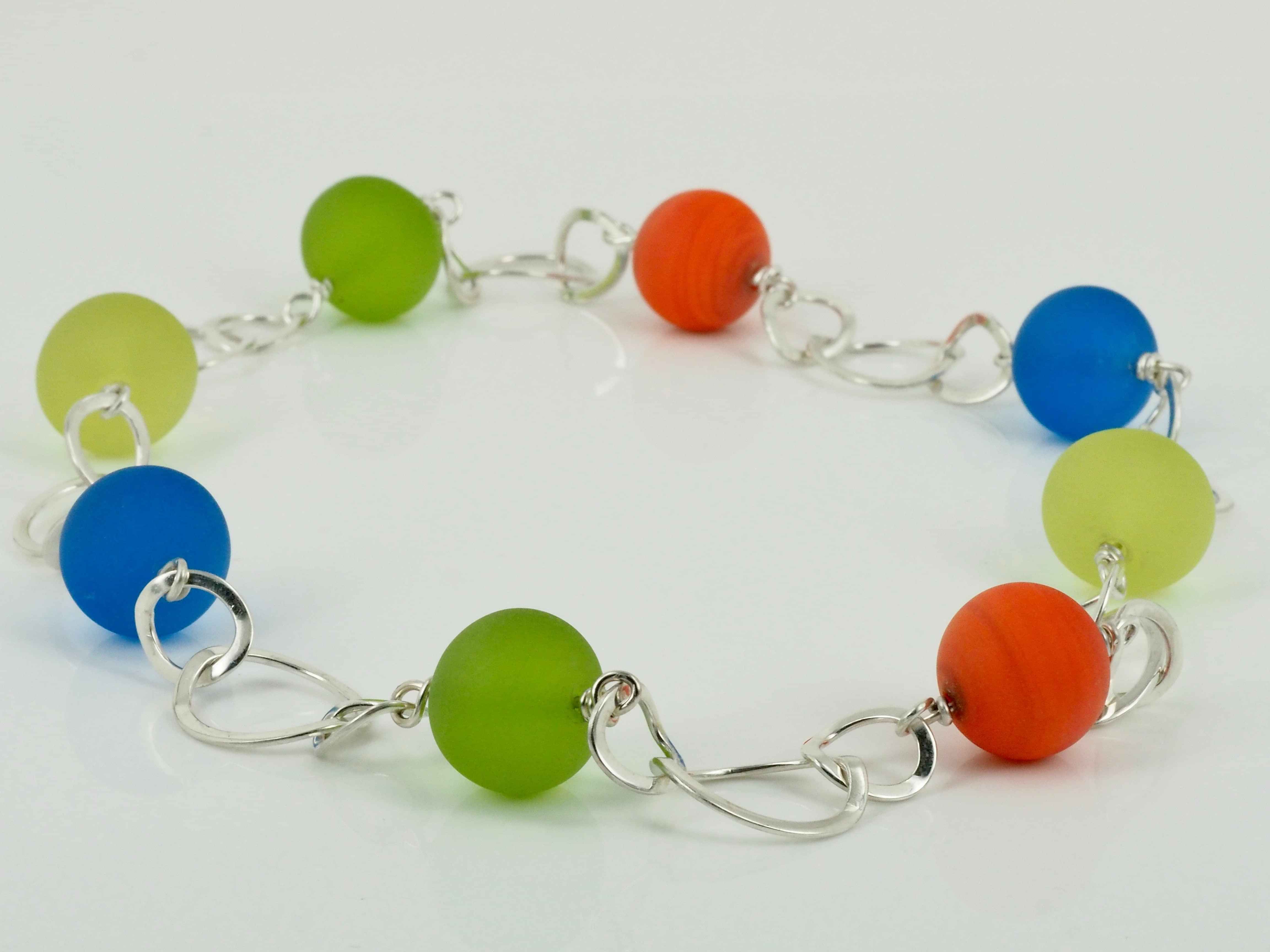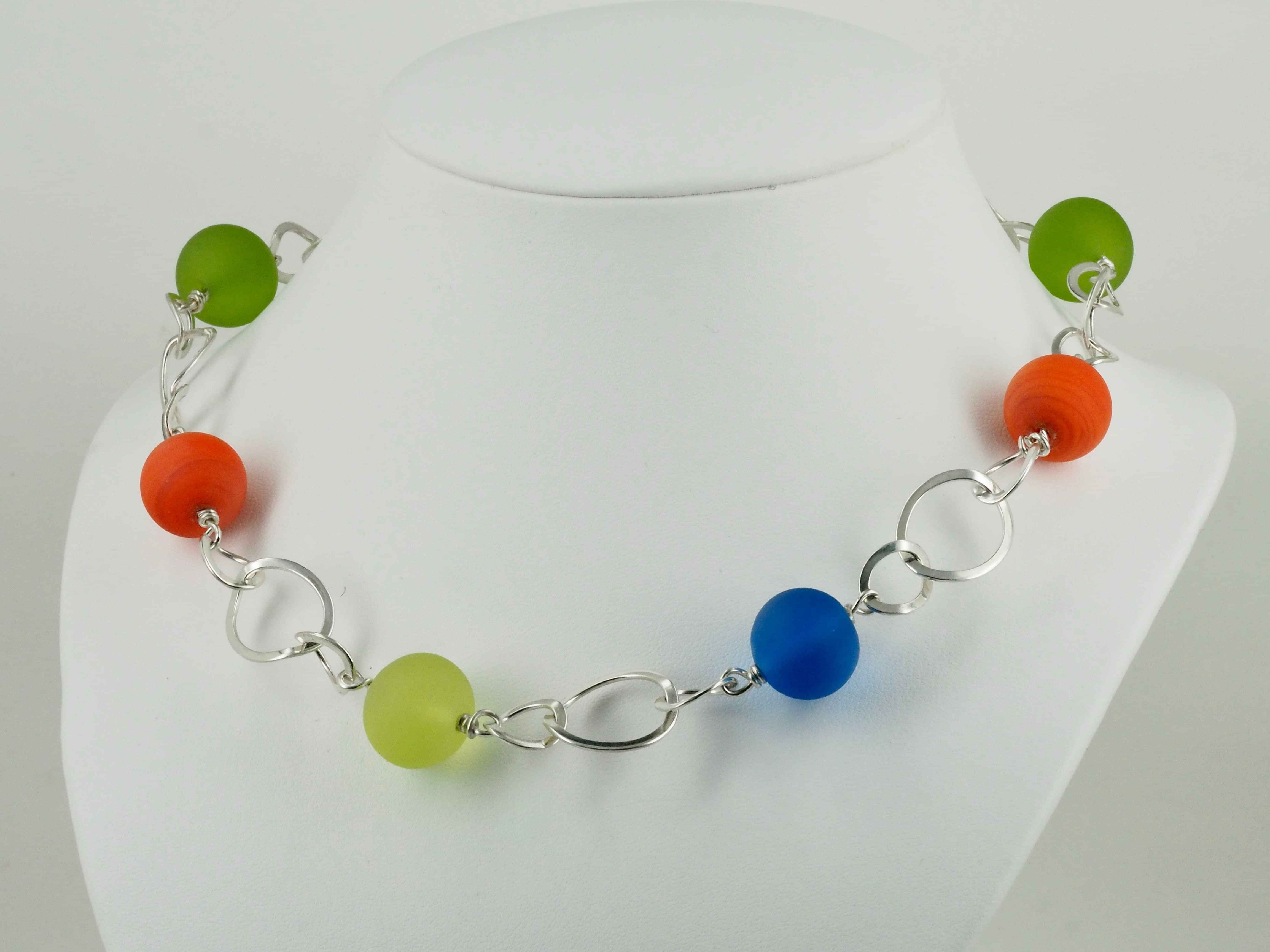 A stunning necklace of matt finished Murano glass beads with large handmade sterling silver links. The links are slightly twisted for a three dimensional effect.