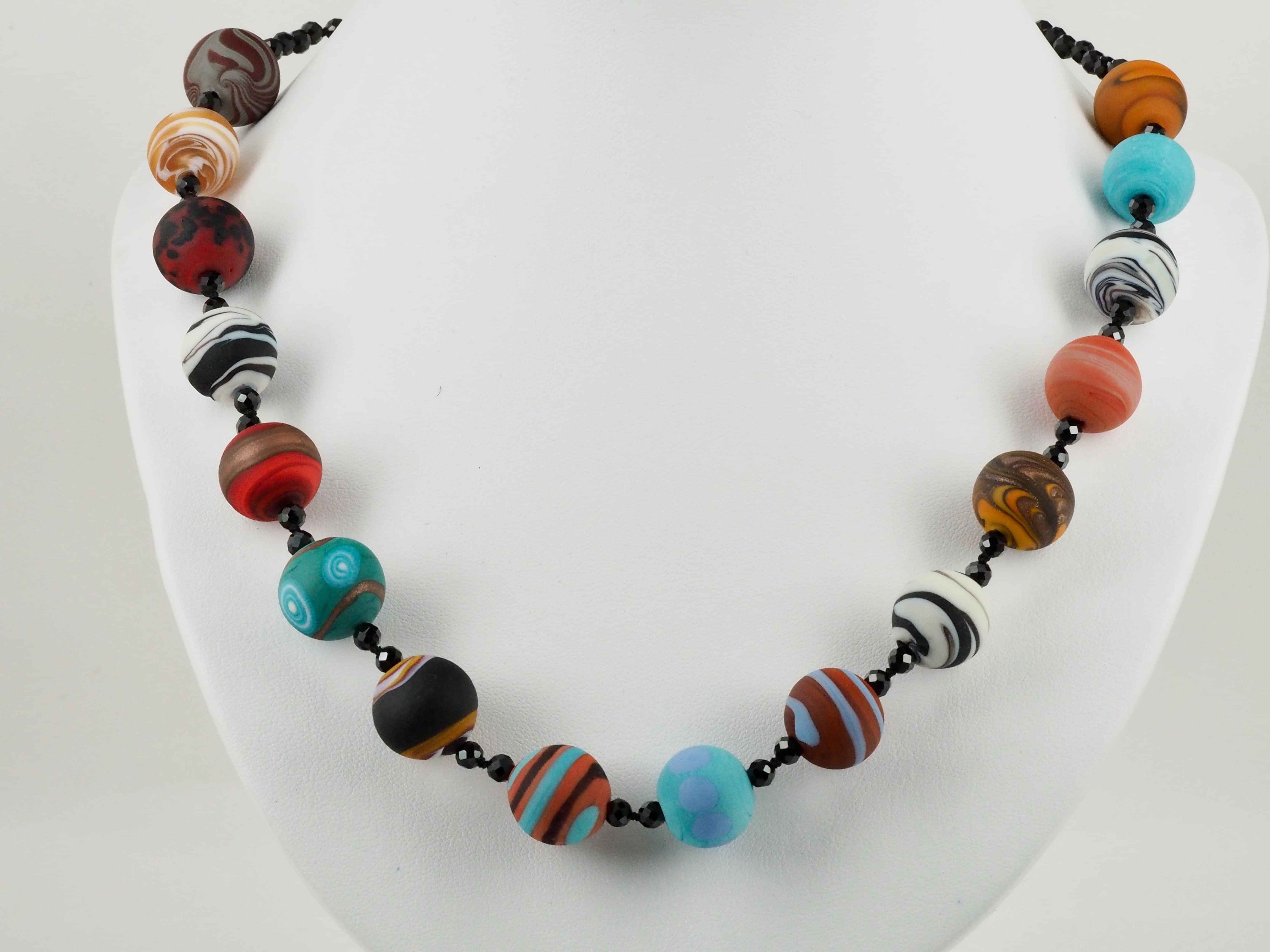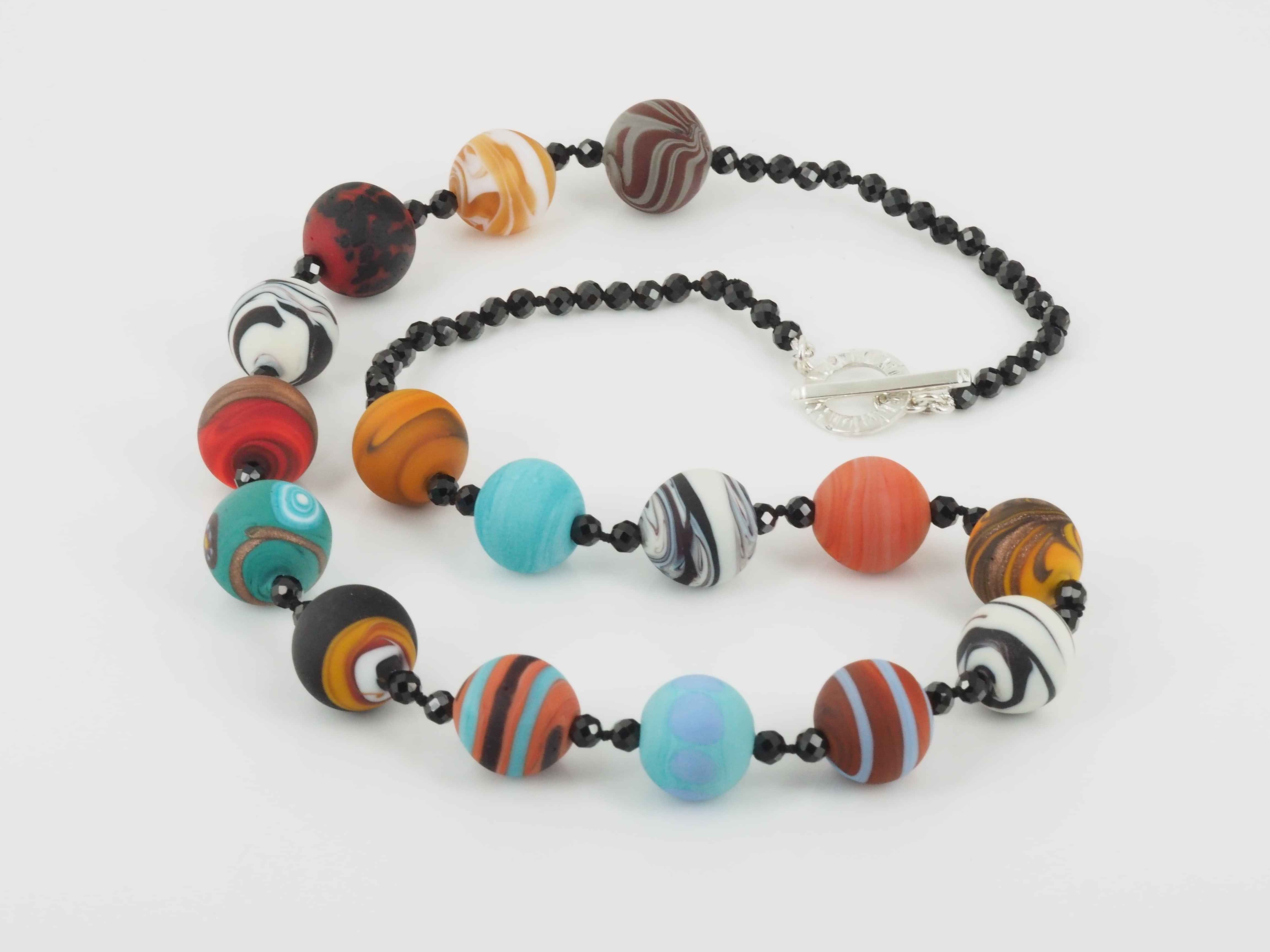 This necklace is a lovely mix of multi coloured, matt finished, Murano glass beads interspaced with sparkly black spinels.