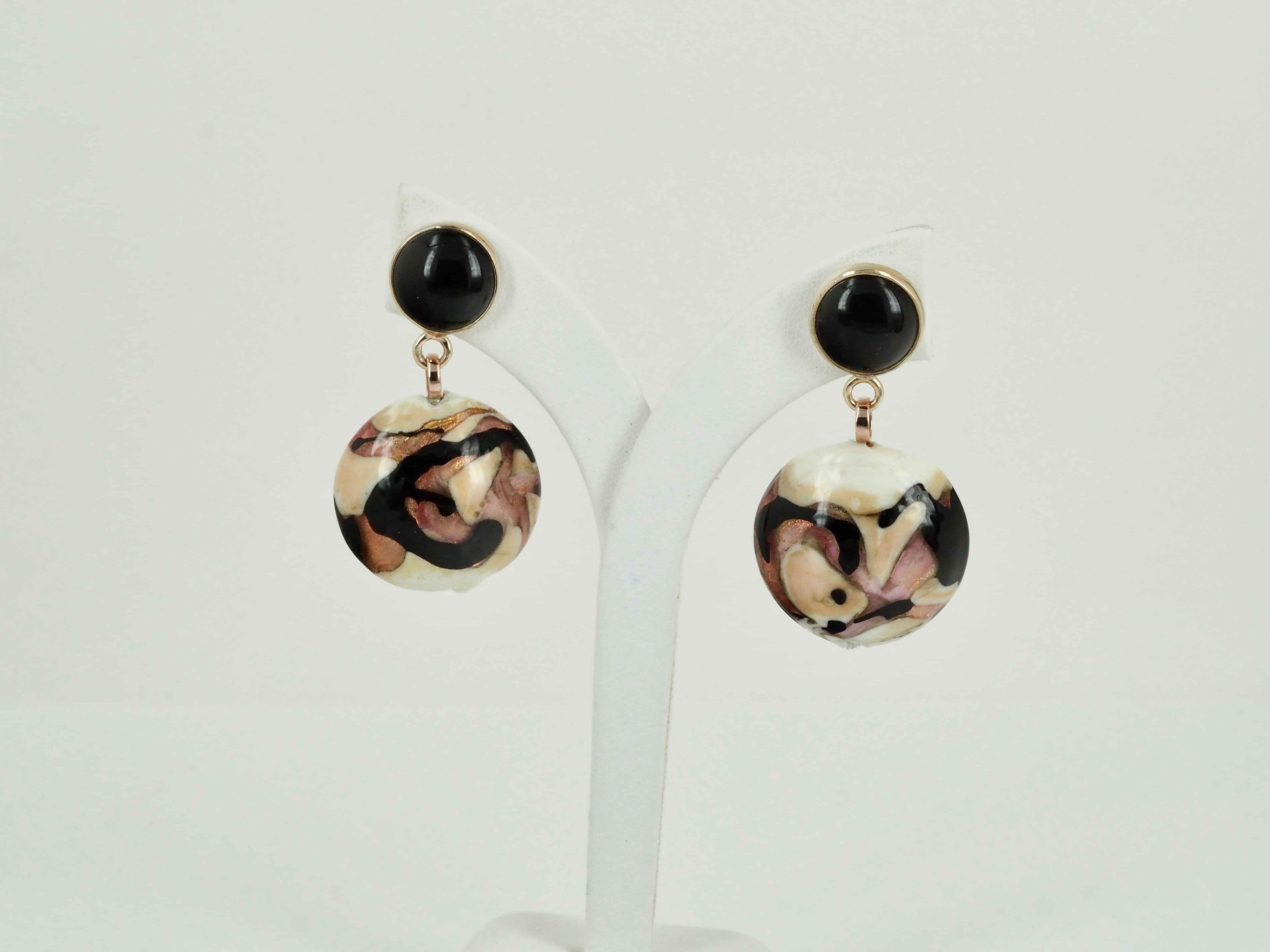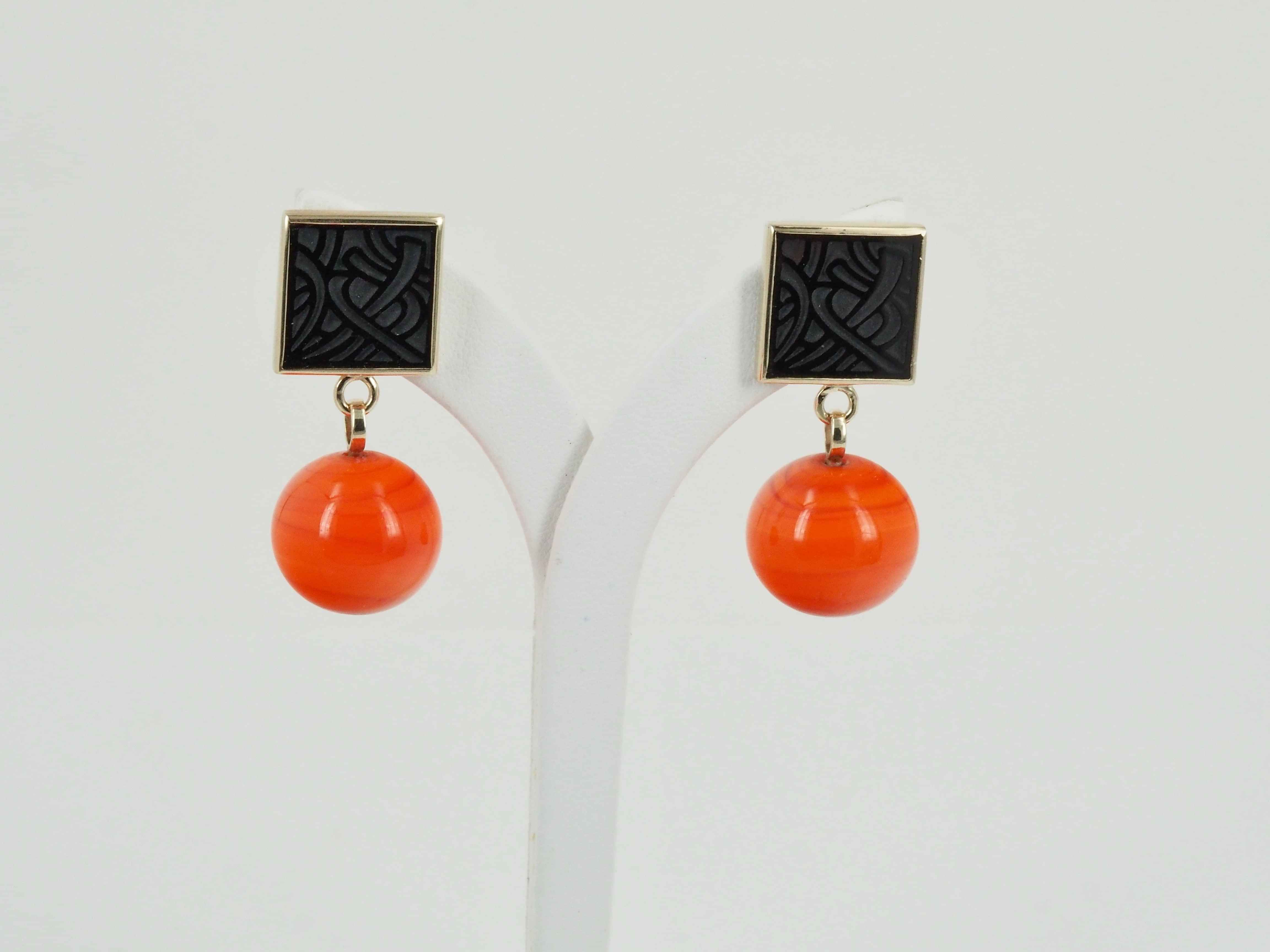 A striking pair of earrings, carved onyx and orange Murano glass beads.